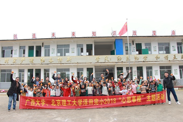 12月27日,广西大学研支团联合北京理工大学研支团在广西自治区富川县浮田小学开展“心想事橙”主题活动,在元旦到来之际为54名学生送去元旦祝福。
